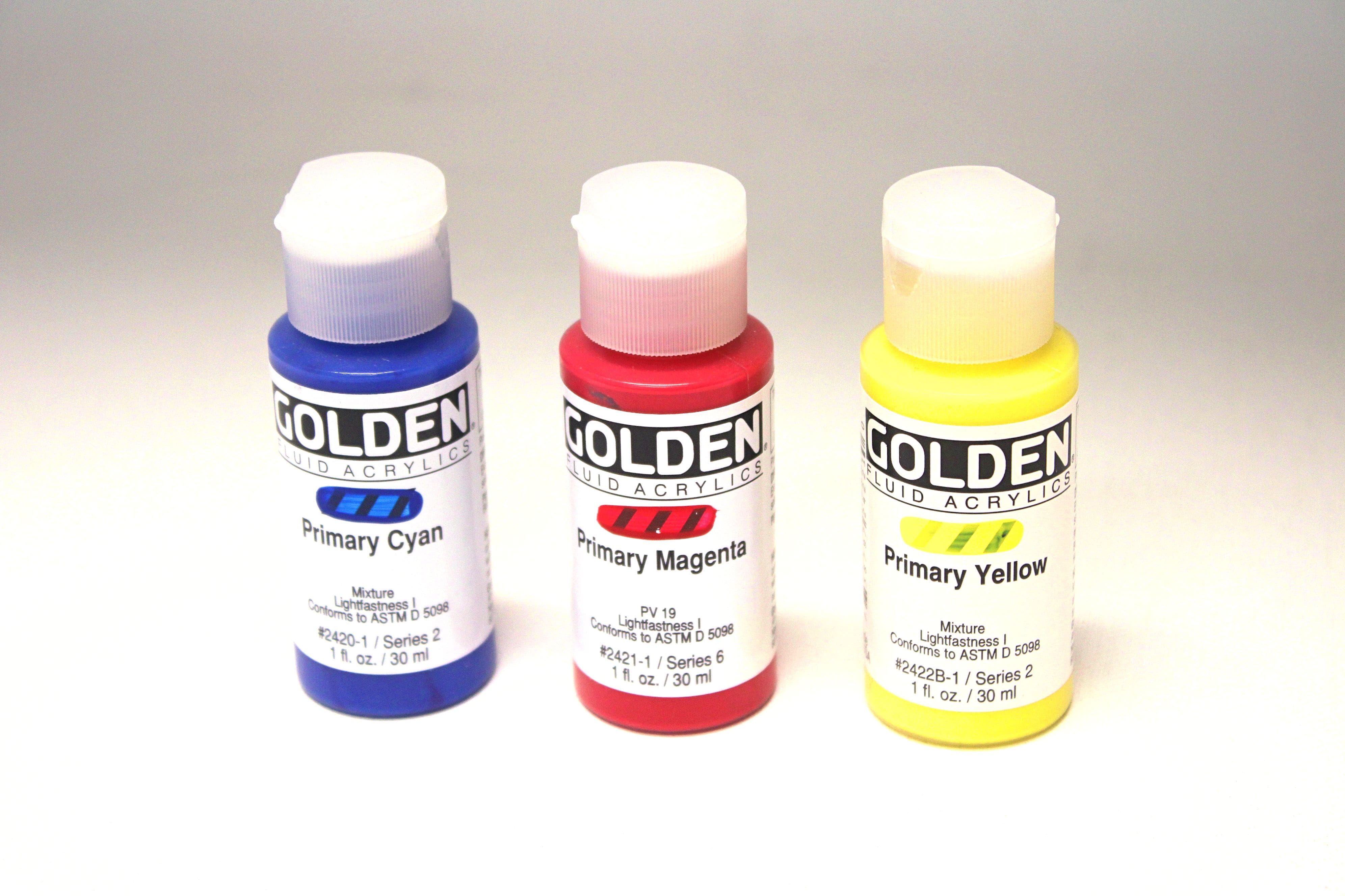 Die flüssige Acrylfarbe GOLDEN FLUID besitzt eine hohe Viskosität und ermöglicht einen glatten, fließenden Auftrag unter Beibehalten der Farbintensität, Nuancenvielfalt, Oberflächenintegrität und Klebfestigkeit. Golden Fluids Acrylfarben eignen sich bestens zum Mischen, da sie sich einfach mit allen Acrylfarben vermischen lassen und problemlos Gels, Medien, Gesso und Grundierungen färben.